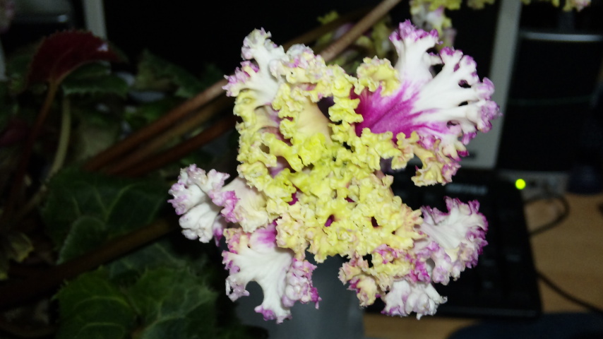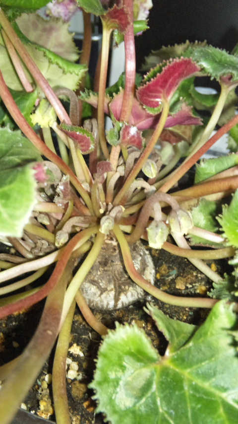 枝変わりした品種に、テルノビーナス、テルノファンファーレ、エンジョイなどがある。葉緑素が少ないせいなのかしら?レースのカーテン越しでも日焼けを起こすそうで、半日陰・部屋の照明が当る場所で管理するといいそう。