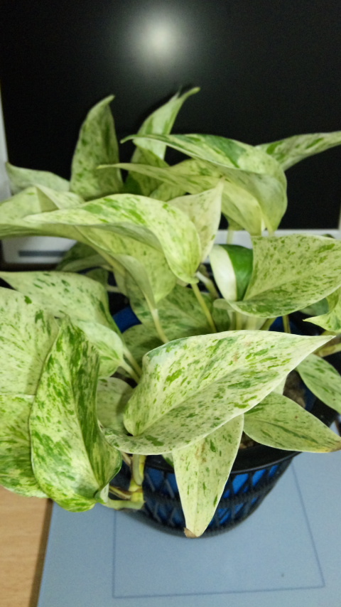 ”葉の形状はポトスと同じですが、突然変異によって緑葉に白斑が入ったのち、白葉に緑斑が入った物がマーブルクィーンです。生育段階で緑斑が強くなり先祖がえりしたように真緑になる葉もよくあります。”