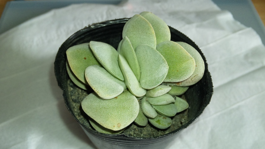 アメリカで作出された品種で神刀(C. falcata )と都星 (C. mesembryanthemopsis)の交配種。幹立ちせず葉が詰まった状態で群生するので蒸れに注意しないとだそうな。葉挿し、芽挿しの両方で増やせる。